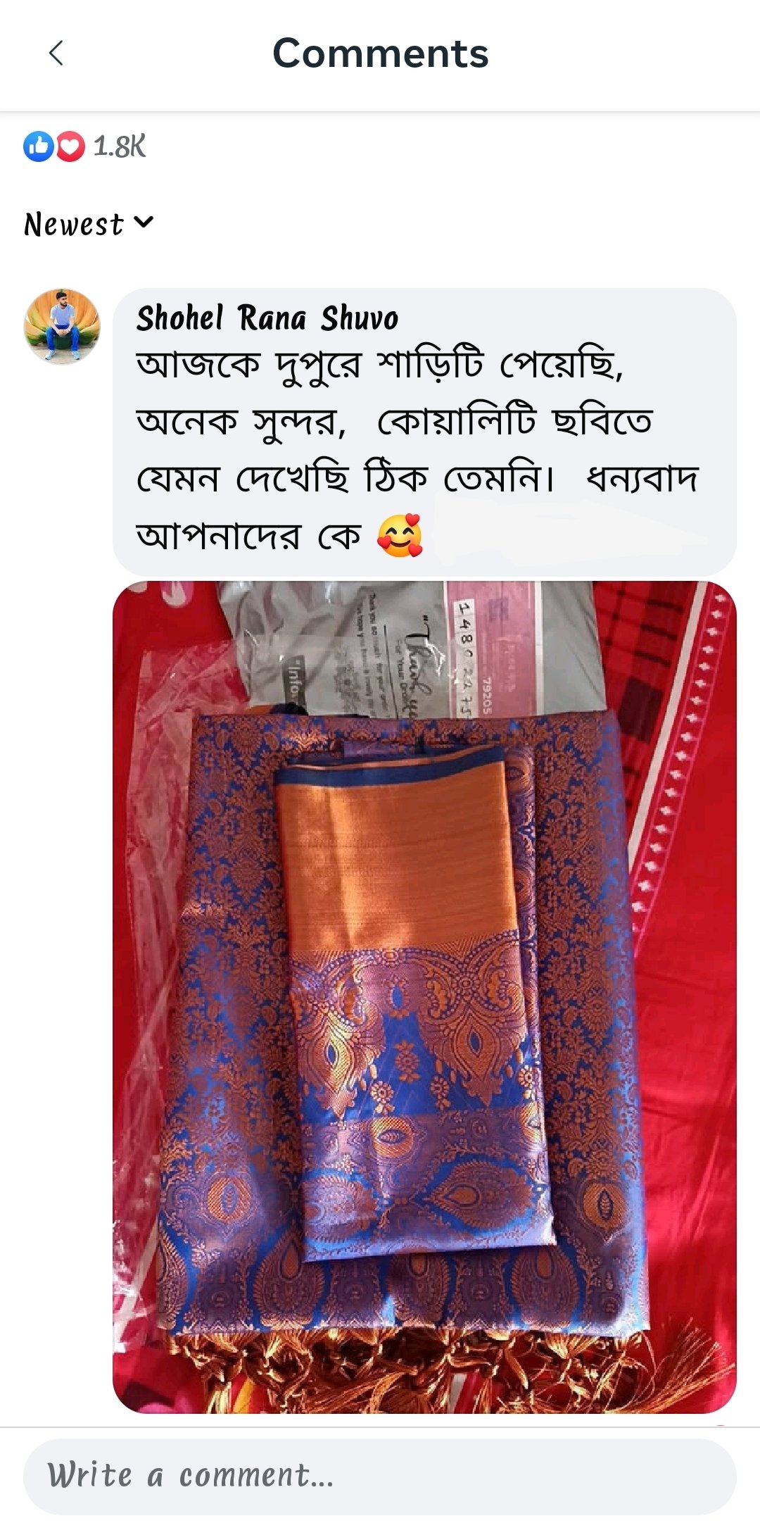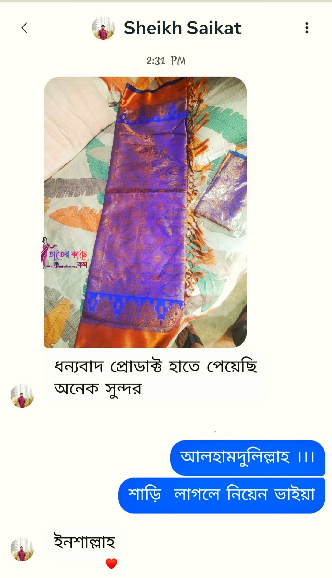 সাবধান বাজারে অন্য জায়গা থেকে কম দামে নকল সিল্ক শাড়ী নিয়ে প্রতারিত হবেন না। অরিজিনাল সেমি মুসলিম সিল্ক শাড়ী এরচেয়ে কমে দেয়া পসিবল না। তাই যদি কেউ অন্য জায়গায় কম দেখে এখানেও কমে নিতে চান, তিনি আমাদের থেকে দয়া করে অর্ডার করবেননা। কারণ আমরা নকল পন্য দিতে পারবোনা।
